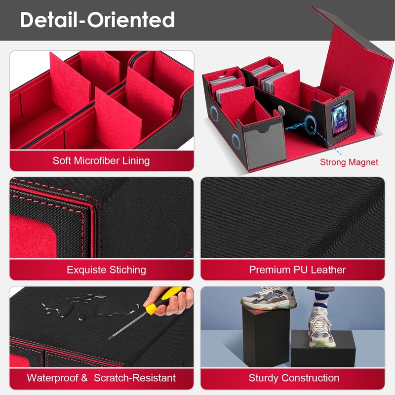 • ●DETACHABLE, REMOVABLE AND ADJUSTABLE: The mtg commander deck box is a game-changer, featuring 2 removable and detachable sections, the 2 sections of the card storage box are held together with strong magnet! Each side of the baseball card storage box boasts 4 slots, where durable dividers can be slotted in the sports card storage to keep your cards perfectly upright and safe from tilting or damage. Plus, those slots and sturdy dividers let you customize the compartments to suit your needs!
