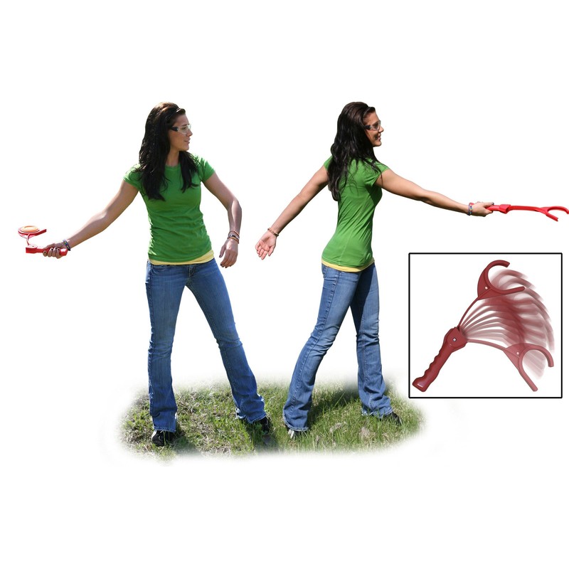 - Handheld clay target thrower with (patent pending) Power Pivot Arm, with ergonomic palm swell and comfort grip finger grooves