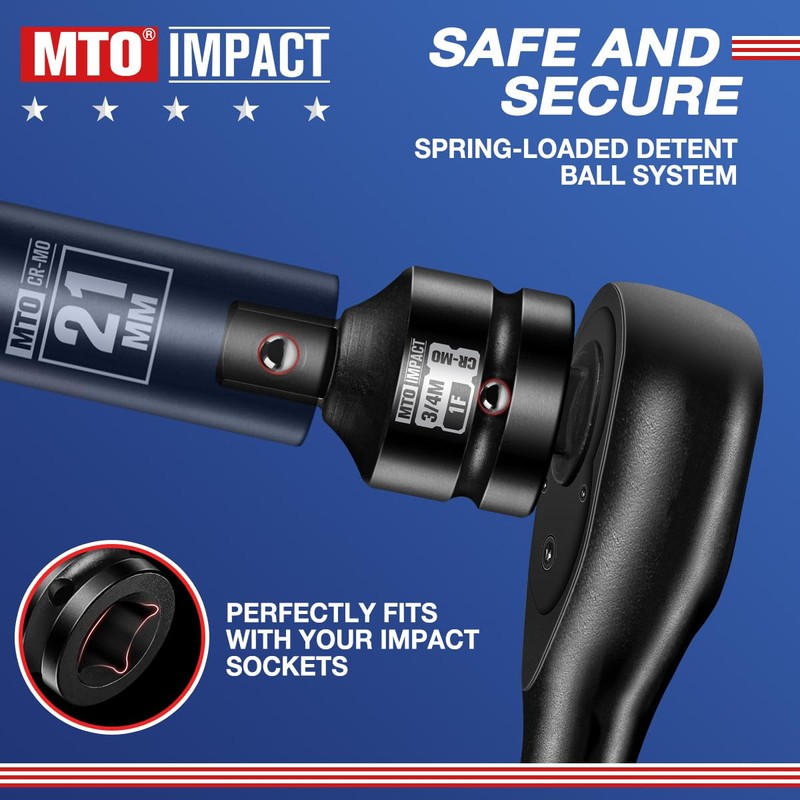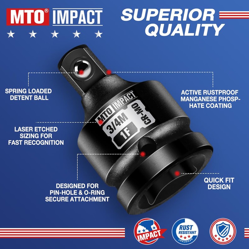 - Excellent quality: MTO 1" to 3/4" socket adapter is made from heat-treated chrome-molybdenum alloy steel to enhance durability, and it features a rust-resistant manganese phosphate coating for superior rust protection; The smart spring-loaded detent ball system prevents dropping, while the through-hole at the drive end securely locks the adapter onto the drive tang, making it safer and more reliable during use