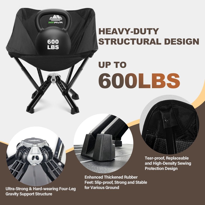 - Capacity 600 LBS: Built with a thicker aluminum frame, 210D rip-proof oxford fabric and high-density sewing protection, MTRVR small foldable compact chair features a four-leg gravity support structure and thick rubber feet for stability and longevity