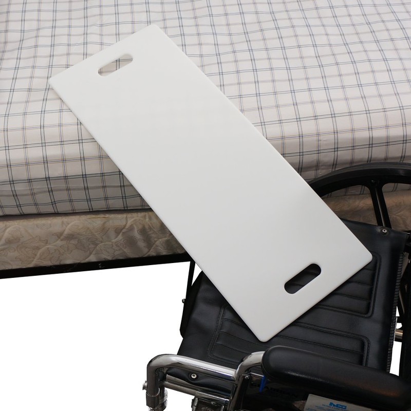 The MTS Medical Supply SafetySure 30" Plastic Transfer Board helps the patient transfer between surfaces of similar or slightly different heights. If you have decreased upper body strength, work with a caregiver to help you transfer. Using the industry standard of “a third, a third, a third”, place one third of the board on the surface you are transferring from, place another third onto the surface you are transferring to, and the remaining third is the space in between the two points you’re transferring from/to. Support your body weight on the flat surface as you move slowly and carefully paying attention to your movement and the location of your body as you transfer across the board. Don’t drag your buttocks on the board. Keep your body in the correct position keeping your feet flat on the floor throughout most types of transfers. When transferring, never put your hands or fingers under the board. For tips on how to use the transfer board, work with your medical care provider, caregiver, or visit YouTube.com for tutorials uploaded by medical professionals.