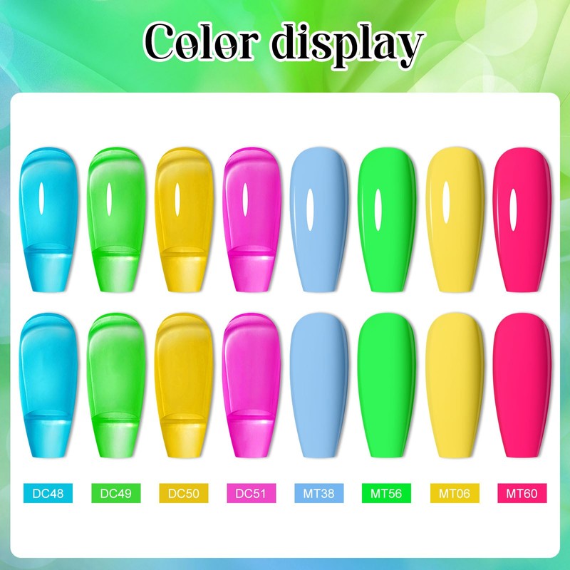 - Package Contents: 4 bottles ice jelly gel nail polish, 4 bottles solid colors gel polish, 1 bottle base coat, 1 bottle top coat, 1 bottle nail dehydrator and 1 bottle bond prime. The set will likely include a variety of bright neon shades like pink, red, yellow, green, blue and rose. You'll be dizzy with delight wearing this neon jelly gel nail polish.
