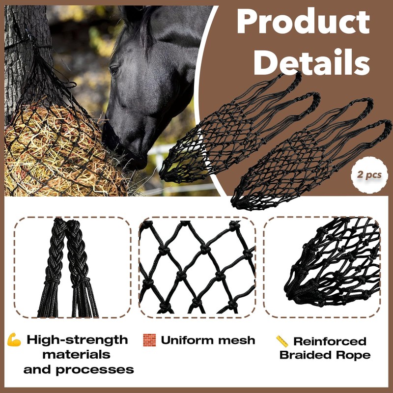 - Material:Built with reinforced nylon ropes and sturdy hanging loops, this Hay Net for Horses withstands rigorous chewing and all weather conditions for long-lasting use