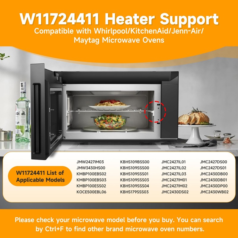 - [W11724411 Heater Support Applicable Models] W11724411 microwave support is compatible with Whirlpool Maytag Jenn-Air kitchenaid microwave support clip: JMW2427IM03, JMW3430HS00, KMBP100EBS02, KMBP100EBS03, KBHS109BSS00, KBHS109SSS00, KBHS109SSS01, KBHS109SSS03, JMC2427IL01, JMC2427IL02, JMC2427IL03, JMC2427IM01, JMC2427DS00. Please check your microwave model before you buy. You can search by Ctrl+F to find other brand microwave oven numbers
