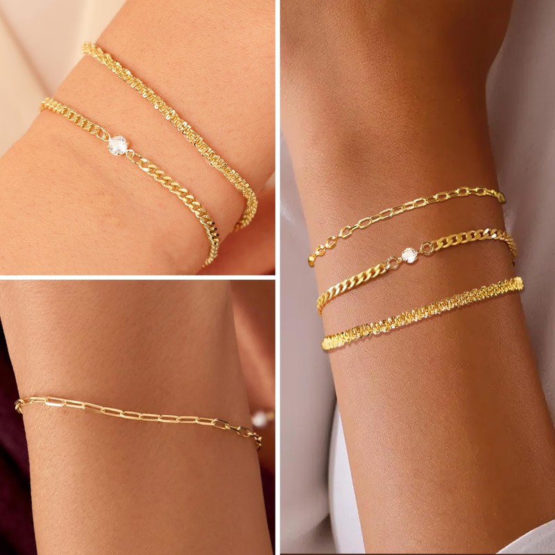 - Women's bracelet sets: our bracelet gold sets are characterised by unique designs and sophisticated look as well as an elegant style that harmonises with the latest fashion trends. This women's gold bracelet is suitable for wearing in multiple layers as well as for wearing alone.