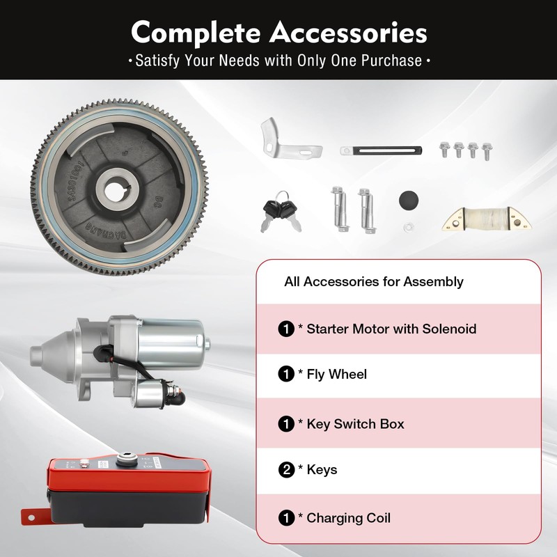 - 【Complete Accessories】Our package includes the starter motor with solenoid, a flywheel, a key switch box with 2 keys, and others to meet your needs in one go.