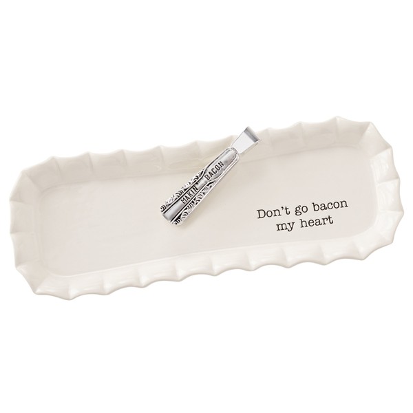 Ceramic bacon tray features ruffle fluted rim and resist "don't go bacon My heart" Sentiment. Arrives with vintage-style "making bacon" Stamped silver plate tongs. Layer with large brunching' Tray for additional service option.