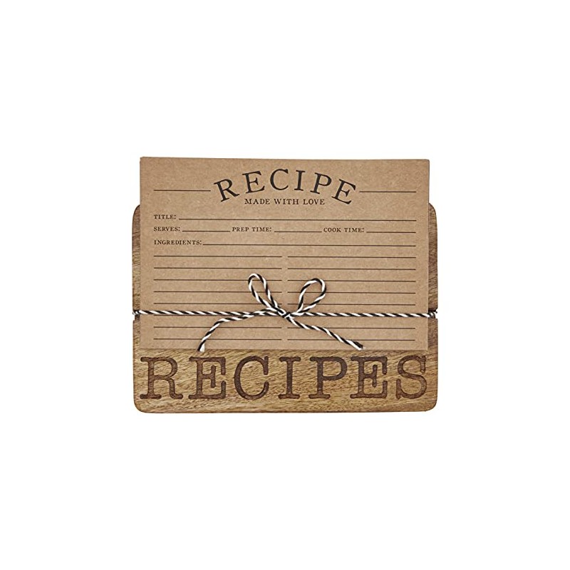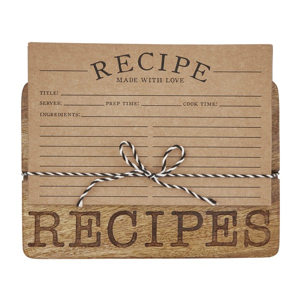 - 2-piece set. Engraved mango wood recipe board comes with pack of 10 kraft cards.