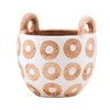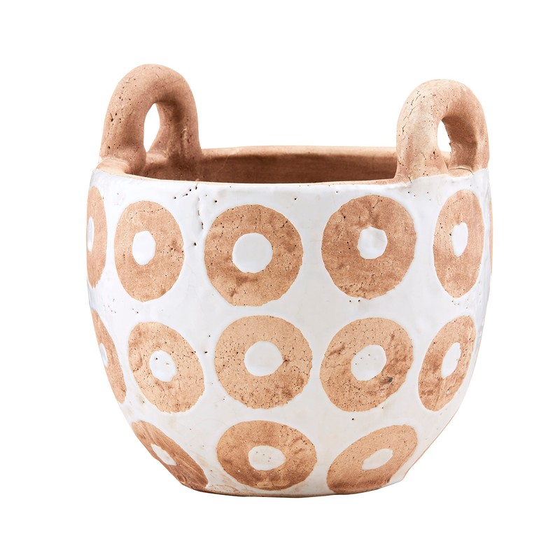 - Accent your home with our white terracotta pot! This white glazed terracotta flower pot features white circles thoughout. This pit has dimensional handles on each side of the pot