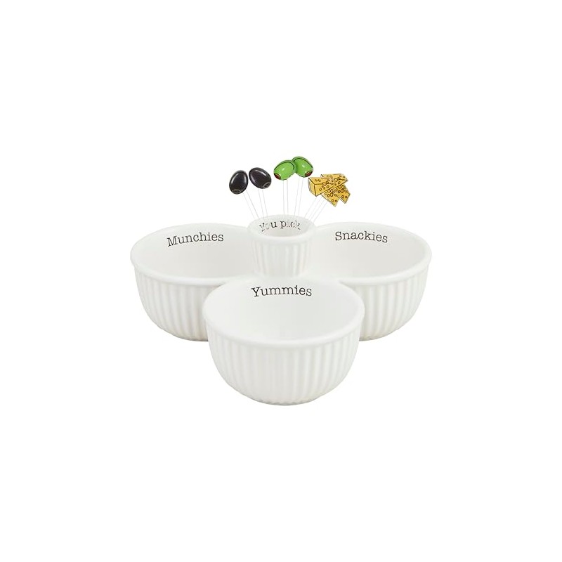- The Textured Ceramic Triple Dip Snack Dish Is Perfect For Serving A Variety Of Snacks, With A Convenient Center Well Designed To Hold The Included Pack Of Six Acrylic Toothpicks