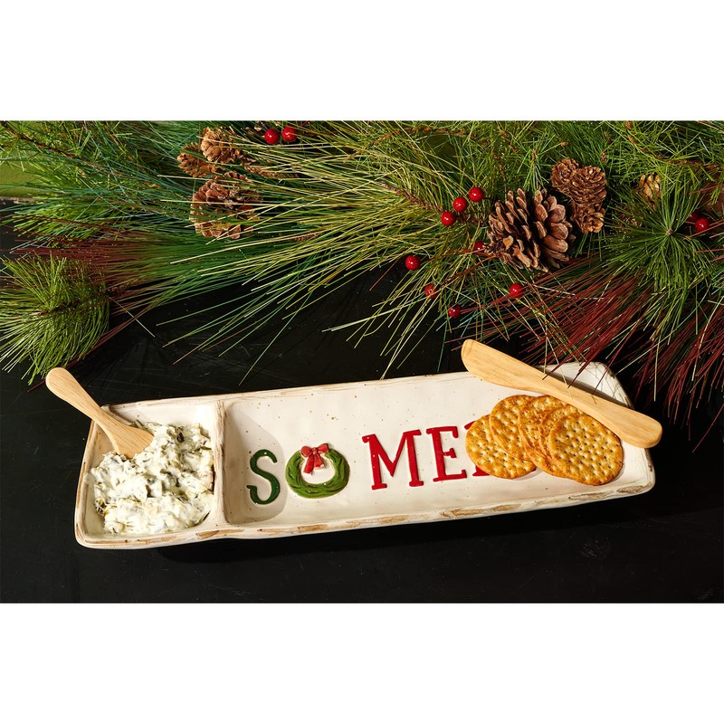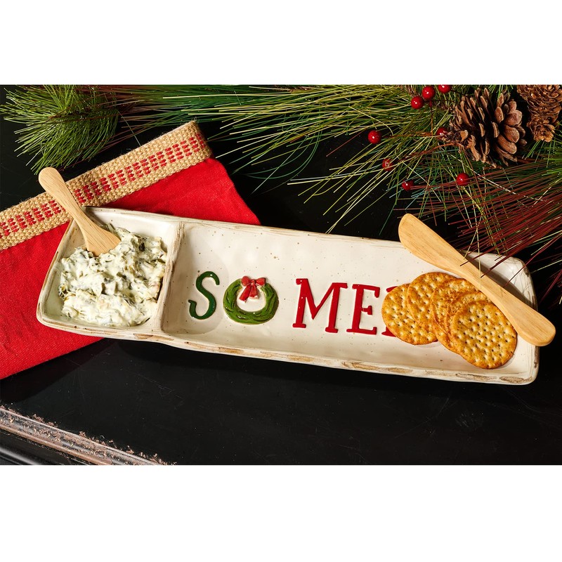 - The tray reads in red writing "oh SO MERRY" with the letter "O" as a green wreath.