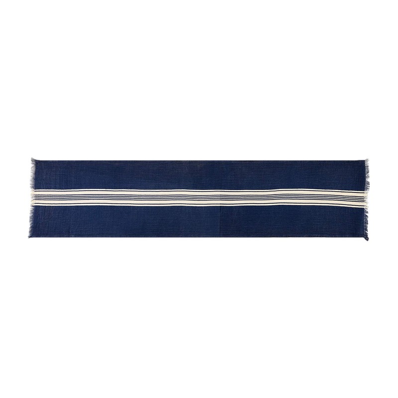 - Our fringe navy table runner is a classic kitchen staple. The striped cotton table runner features fringe end detail. The background of this table runner is navy, with cream stripes down the center of the runner. This table runner pairs well with our fringe navy dinner napkins, which feature coordinating prints.
