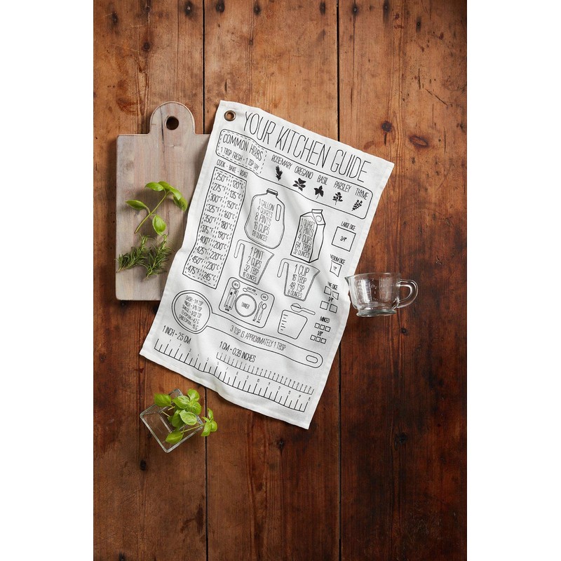 • This kitchen measurements towel set is great for college students or new homeowners. The two piece set comes with a glass two cup measuring cup with cup measurements. The measuring cup arrives with printed cotton measuring guide towel that features common kitchen guides like conversions for temperature and measurements.