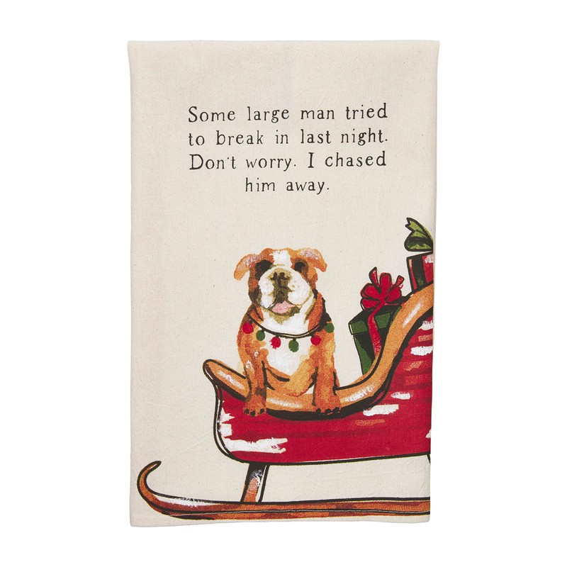 - The hand-painted cotton hand towel features a dog sitting in Santa's slay.