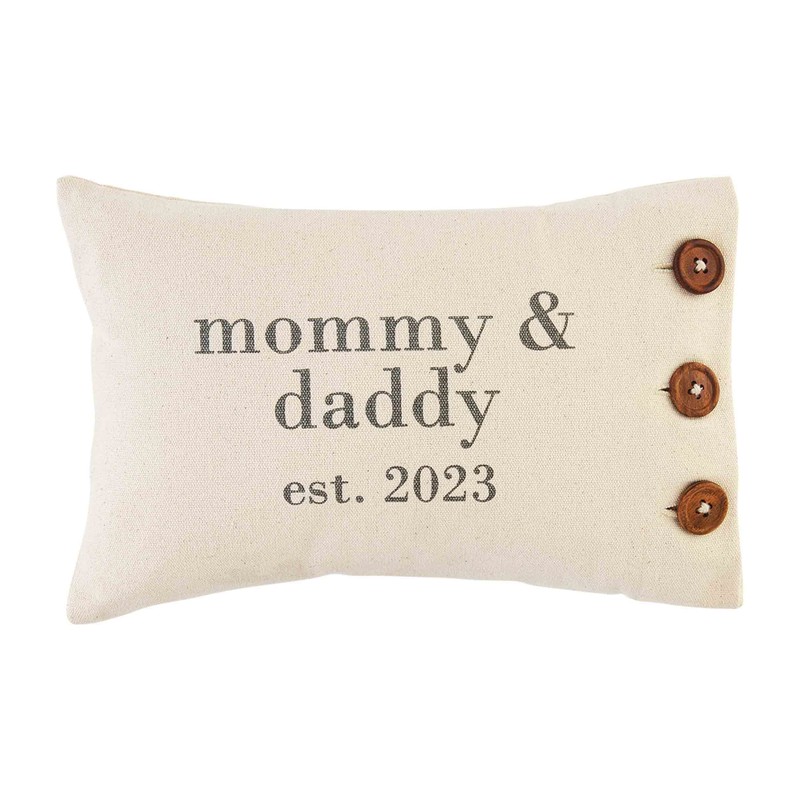 - The pillow reads "mommy & daddy est. 2023".