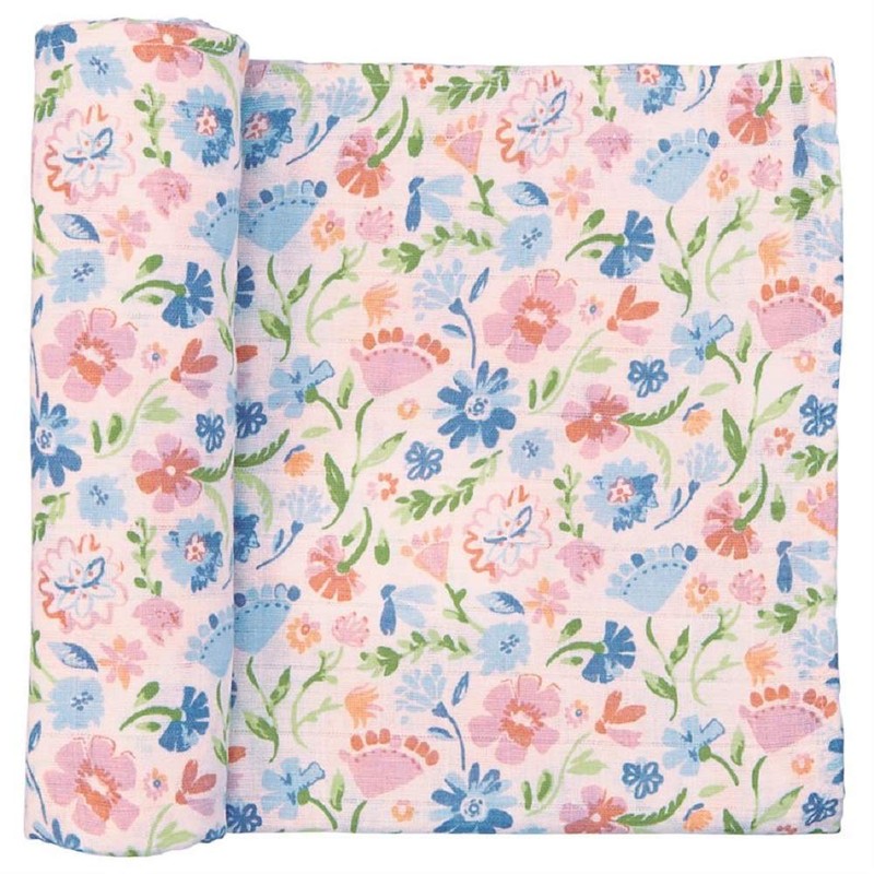 Generously sized square muslin swaddle blanket features original Mud Pie print and arrives in kraft gift box with hat ribbon handle. Blanket softens with every wash.