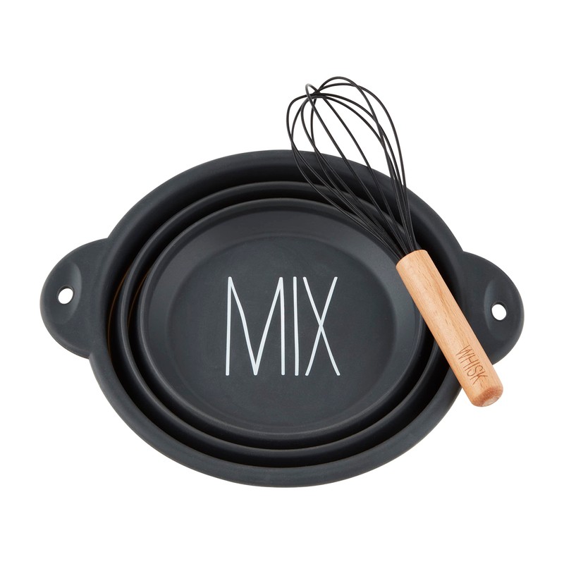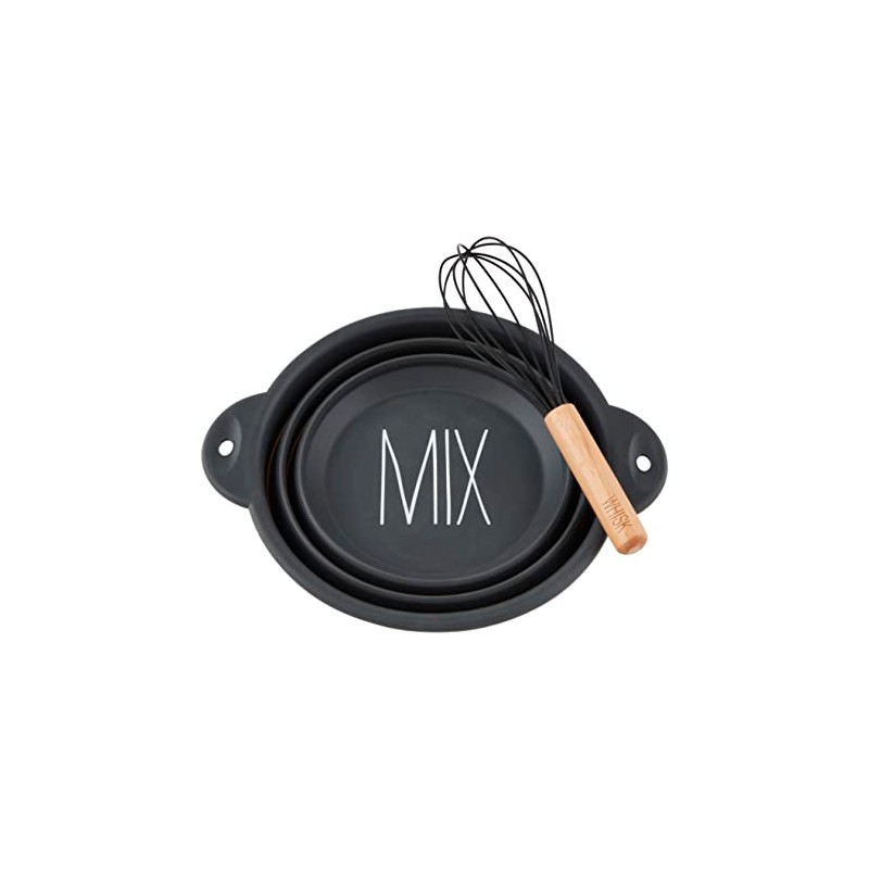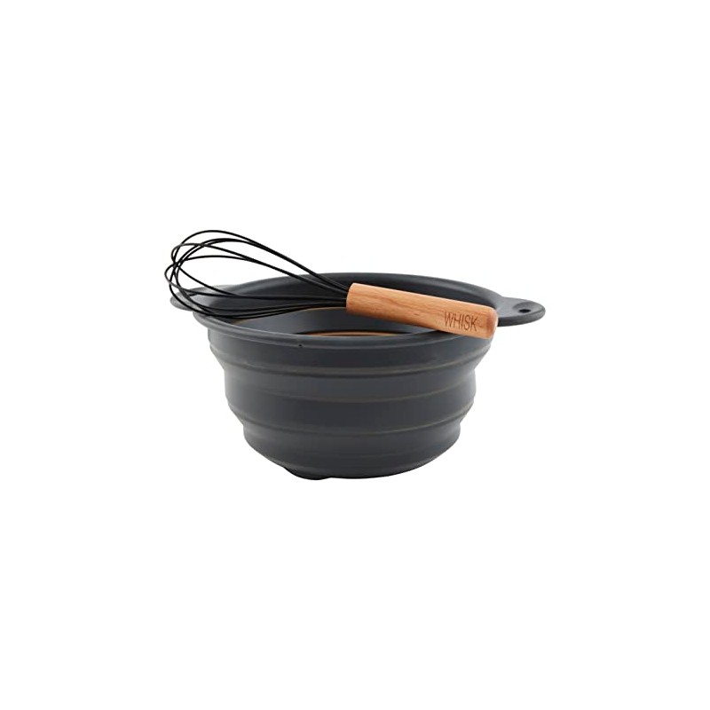 • This two-piece set includes a collapsible silicone mixing bowl along with wood and silicone whisk.