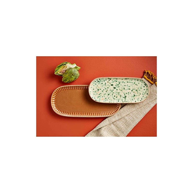 • The platters are made of stoneware. These platters should be hand washed as needed. The large platter measures 16" x 7 1/2". The small platter measures 14" x 6".