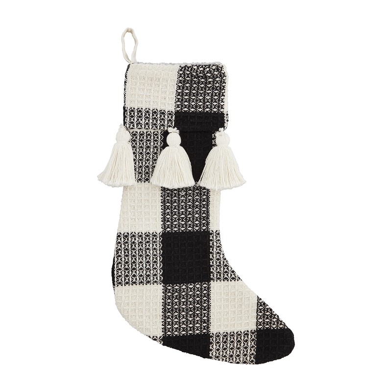 Mud Pie, Tan, Buffalo Check Tassel Christmas Stocking, 19" x 11.5", 19" x 11 1/2"