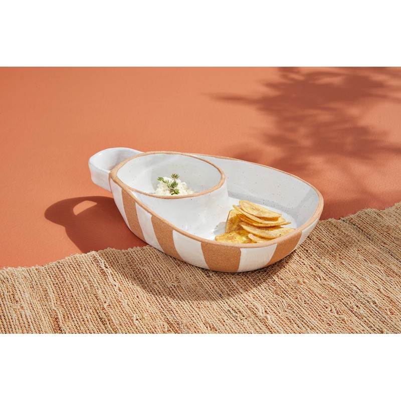 - his Chip and Dip server features white glazed and exposed terracotta.
