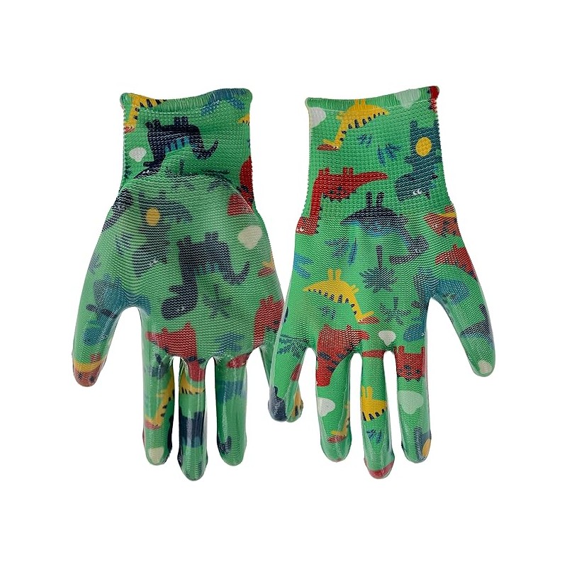 MUD Simply Kids (ages 5-8) Garden Gloves, Nitrile Coating, Lightweight, High Dexterity, Moisture Wicking, Green/Dino Pattern (MD31041M)