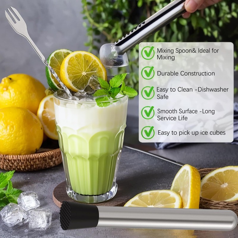 - Professional 3-in-1 Bar Tool System Stainless steel set: serrated-tip ice tongs (9.6"), textured muddler, and 10" dual-end bar spoon. Premium steel construction Dishwasher safe. Ideal for mojitos, lemonade, and fruit drinks