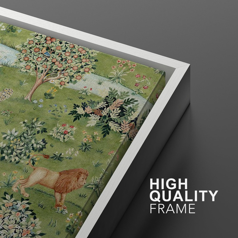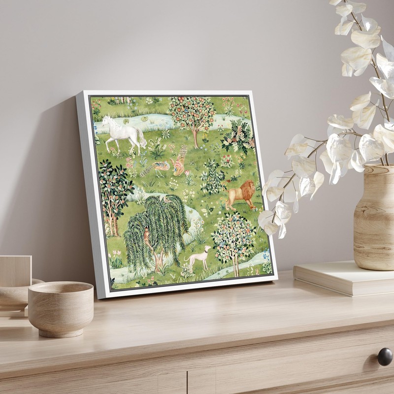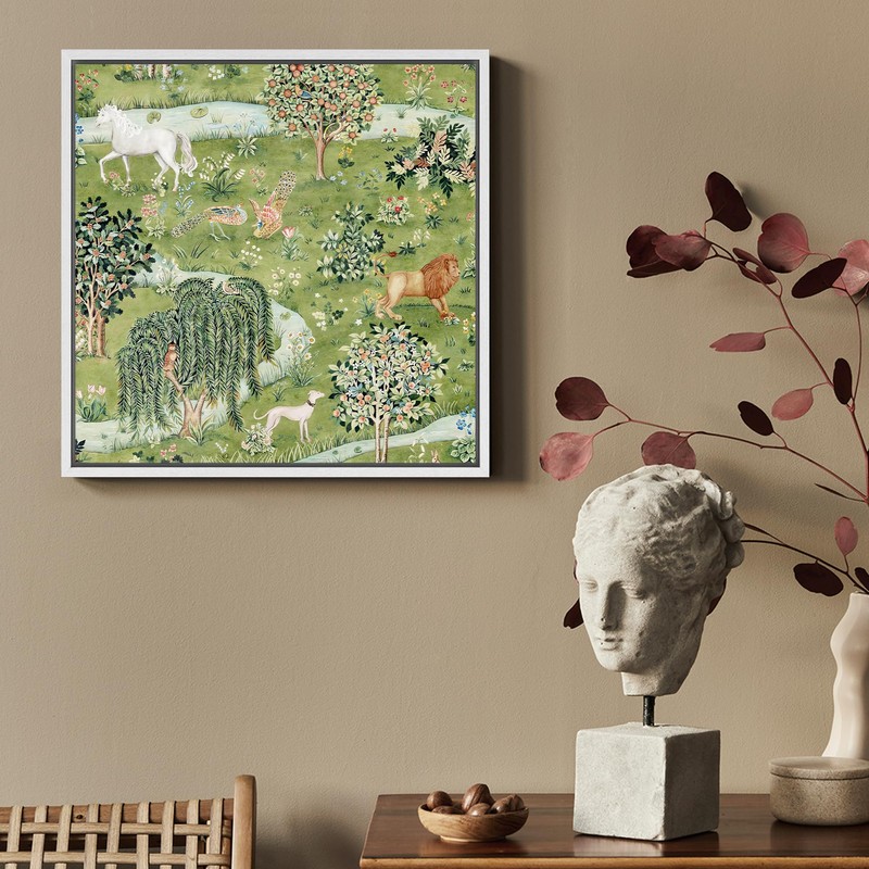 MUDECOR Framed Canvas Print Wall Art Whimsical Garden Scene with Unicorn, Lion, and Peacock in a Lush Landscape Illustrations Realism Decorative for Living Room, Bedroom, Office - 24"x24" White