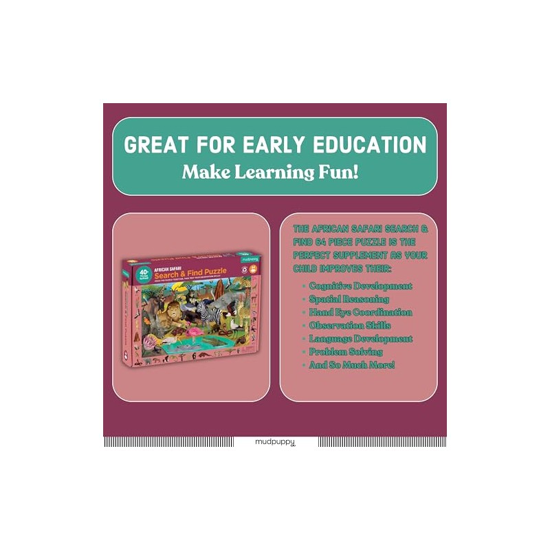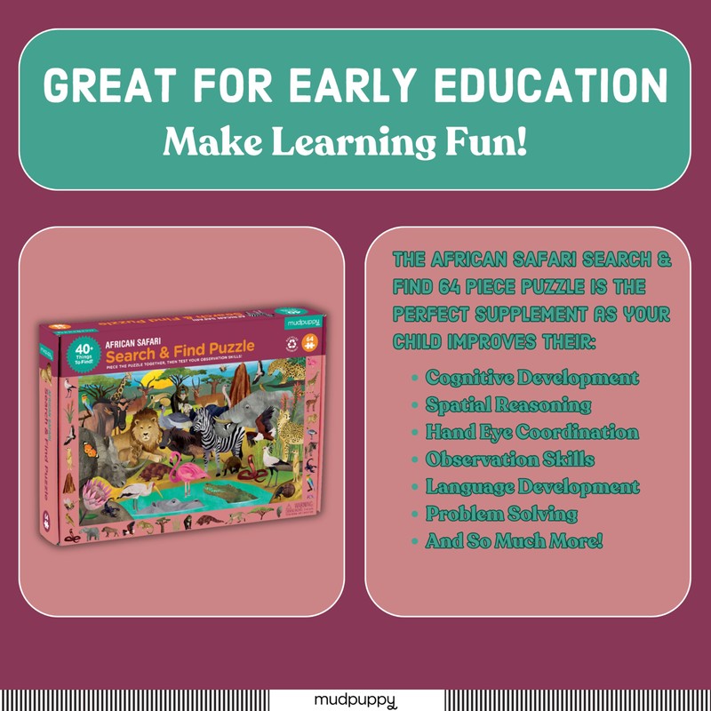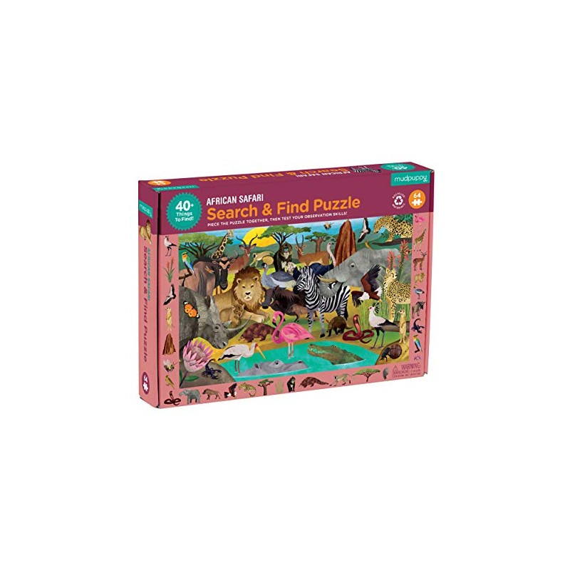 - 64-PIECE PUZZLE – The 64-piece African Safari Search and Find Puzzle from Mudpuppy is perfect for children ages 4 and up to complete on their own or with help. The finished puzzle measures 23” x 15.5”.