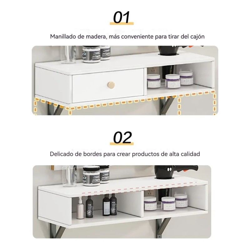 Equipado con un soporte para secador de pelo: puede colocar un secador de pelo y otras herramientas al mismo tiempo. Hemos diseñado un espacio específicamente para tu secador de pelo para que puedas colocarlo de forma segura y cómoda, liberando valioso espacio en el mostrador.