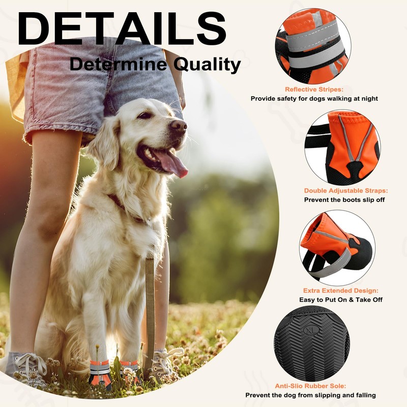 - Easy to Put On & Take Off - Our dog shoes use a wide split seam opening and two adjustable and reflective straps, which can be adjusted to the right size according to your dog's leg circumference, making it easy to put on and take off the dog shoes. The reflective straps provide better visibility at night, ensuring your dog's safety when walking at night.