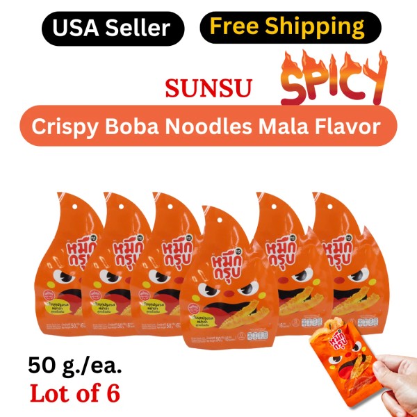 Sunsu Muek Groob is a delicious, crispy snack made from boba noodles infused with authentic Mala flavor. This traditional recipe delivers a perfect balance of spicy, numbing heat with the aromatic spices of Sichuan. With a crunchy texture similar to jellyfish, it’s the ideal snack or accompaniment to your meals. Each pack contains 6 small sachets (8.3g each) of crispy goodness, perfect for snacking or as a side dish to your favorite dishes. Available in mild and spicy options.