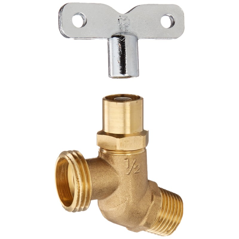 B & K loose key hose bibb valve for use with water or oil. Neoprene seal washer. 3/4 hose thread outlet. Large flow. Pipe threads comply with ANSI B1.20.1 Hose threads comply with ANSI B1.20.7. Loose key prevents use of valve when removed. Meets NSF 61-9 approved low lead standards. Boxed. 1/2 In. MIP. Loose key design prevents valve being used while key is not present.