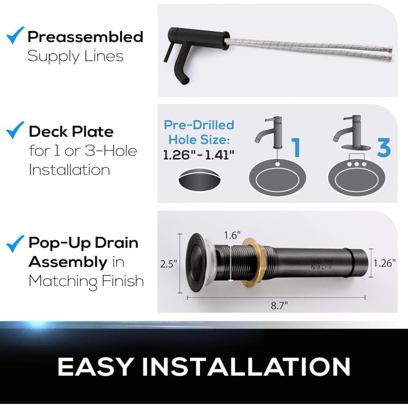 - Easy Installation - With the easy-mount design, the faucet is a breeze to install. Everything you need is together in one box, including a deck plate for 1–hole or 3-hole installation and coordinating metal pop-up drain assembly and supply lines that are preassembled. Pre-drilled Hole Size: 1.26"-1.41"