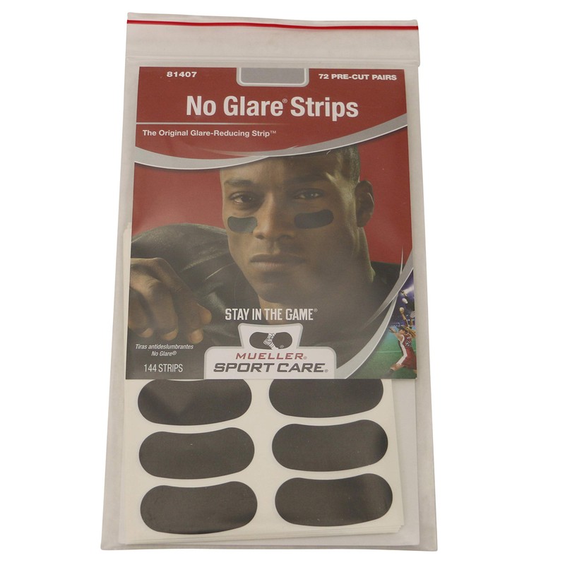 Mueller No Glare Glare-Reducing Strips reduce glare from the sun and bright lights. Great to use for outdoor sports such as football, baseball, and softball. These pressure-sensitive, maximum glare reducing strips are almost twice as effective as paste. They are easy to apply and remove. Because they are a sticker-like strip, they won't smear or sweat off. They also won't stain uniforms and other clothing, and you can confidently dry your face with a towel. Country of Origin: United States.