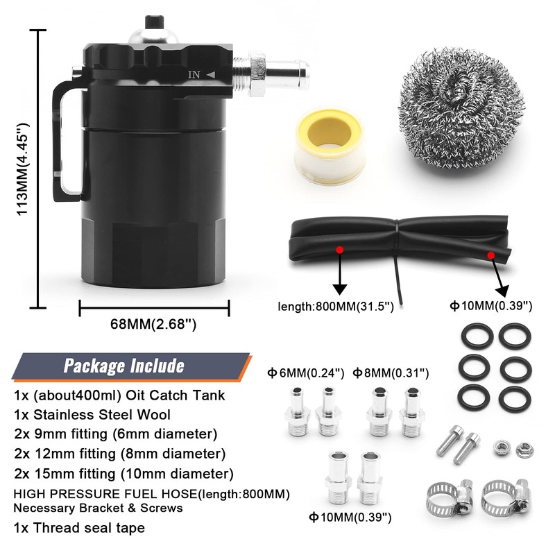 - √ UNIVERSAL&400ML - The air oil separator catch can kit fits for most cars and small parts of motorcycles. And the capacity of the polish baffled reservoir is 400ml,enough for daily use.