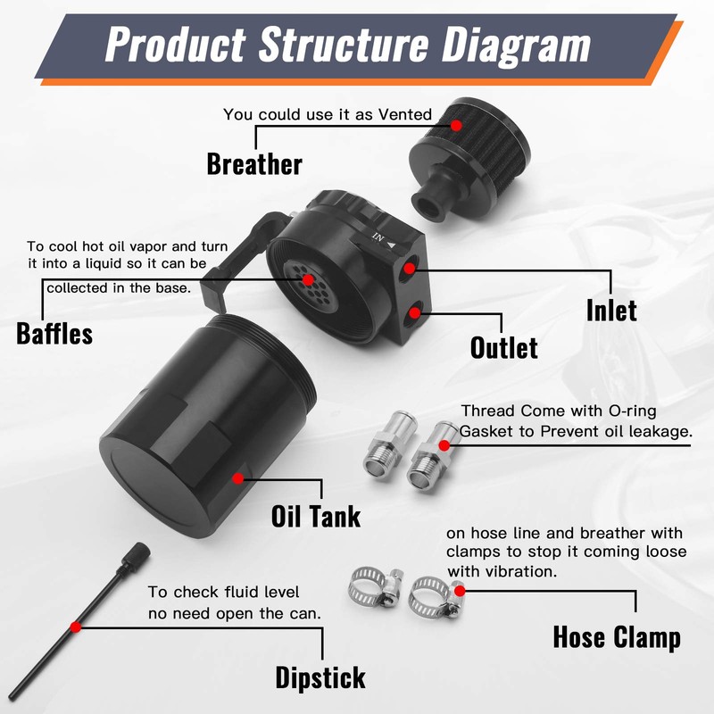 - √ 2 TYPES OF INSTALLATION - Easy to install oil catch can with breather filter as a vent system or without breather filter as a seal can, all for your option.