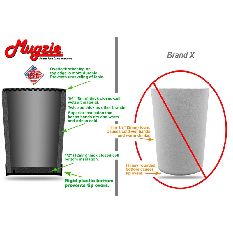 The Mugzie iced coffee neoprene sleeve is not just about keeping your drink cold, it also offers additional features for your convenience. The insulated rigid plastic bottom adds stability and prevents tip overs, allowing you to enjoy your drink without worrying about desk puddles or table rings. With a nearly half inch (10mm) of closed-cell neoprene insulation on the bottom, the koozie style Mugzie provides even more insulation. This iced coffee coolie is easily hand washed and proudly made in the USA. Upgrade your iced coffee experience with our reusable coffee sleeves and say goodbye to wet hands and warm drinks.