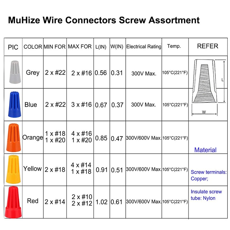 - QUICK ASSEMBLY - Color Coded Screw on twist nuts connectors provides a very low cost and quick solution for wiring project. CSA Listed. Muhize twist nuts caps connection saves time and effort.