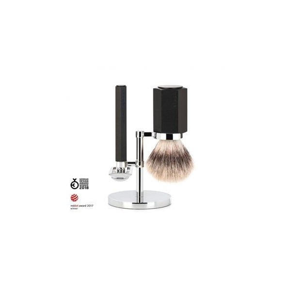 The Muhle S 31 M HXG Graphite Gift Set is a 3-part shaving set designed by Mark Braun, featuring a shaving brush with Silvertip Fibre®, a safety razor, and handles made of anodised aluminum in a graphite color. This gift set is perfect for those who want a stylish and contemporary shaving experience. The hexagonal form of the brush and razor create a classic tool aesthetic, while the anodised aluminum handles and chrome-plated metal stand add a modern touch. The Silvertip Fibre® brushhead provides a soft sensation on the skin when lathering, while the classic razor blade produces a very close shave and lasting result. What are the benefits and features of Muhle S 31 M HXG Graphite Gift Set? Stylish and contemporary design. Hexagonal form of brush and razor create a classic tool aesthetic. Anodised aluminum handles and chrome-plated metal stand add a modern touch. Silvertip Fibre® brushhead provides a soft sensation on the skin when lathering. Classic razor blade produces a very close shave and lasting result. Who is Muhle S 31 M HXG Graphite Gift Set for? This gift set is perfect for men who want a stylish and contemporary shaving experience with high-quality materials and a classic tool aesthetic.