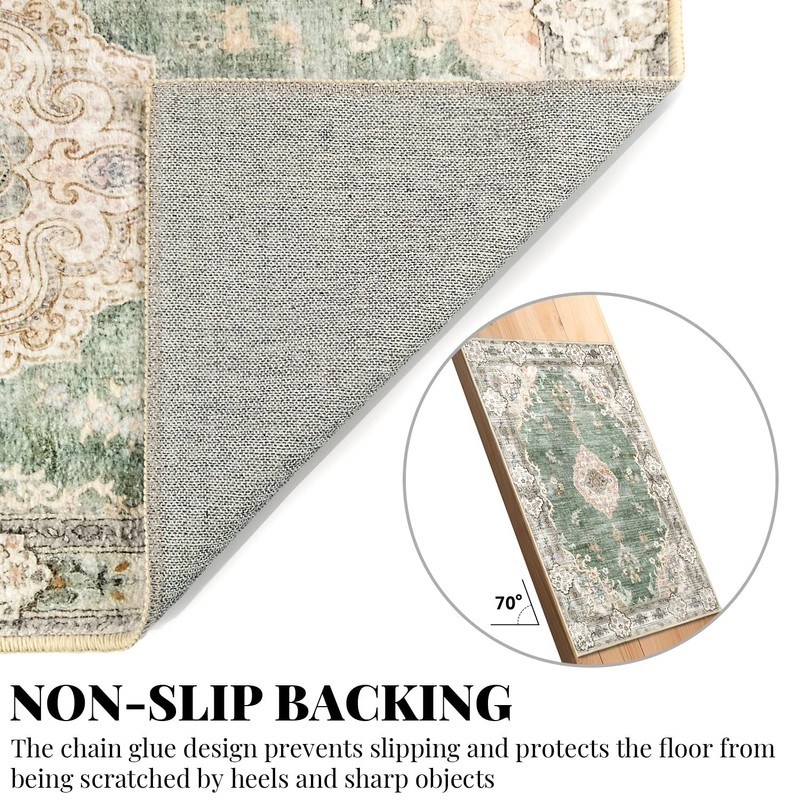 - MULTI-PURPOSE:Vintage washable rugs 4'x6.5' is a fluffy, low-pile design that is soft enough for people and pets. Now use this green carpet as a entryway rug to make your home feel more homey, or as a bedside rug,living room rug,front door rugs indoor,entrance rugs indoor,indoor door mats,bathroom rugs,kitchen rug, laundry room rug, office rug is also a good choice.
