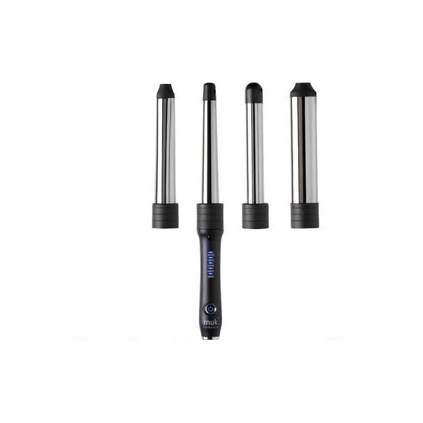 The Muk Curl Stick Black V2.0 is a versatile hair styling tool with four interchangeable barrels coated in smooth titanium for creating smooth, static-free curls with a glamorous shine.