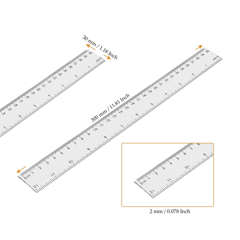 - DOUBLE SIDED MEASUREMENT - There are scales on both edges of the plastic ruler to measure, they are metric system 30 centimeters and imperial system 12 inches, which can meet your different measurement needs.