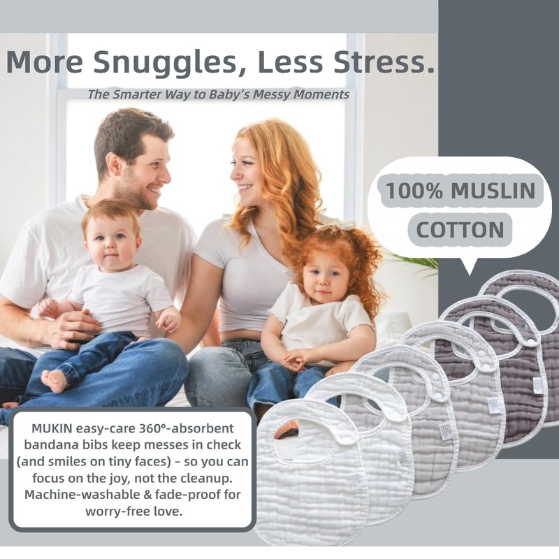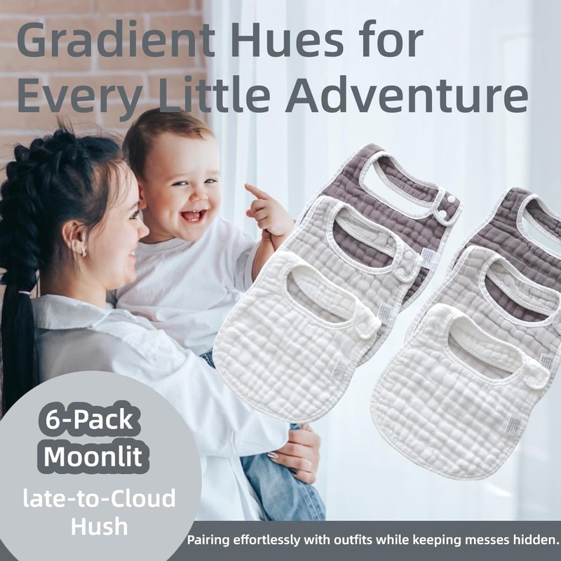 MUKIN Baby Muslin Bibs and Burp Cloths, 6 Pack, Soft Absorbent Cotton, Adjustable (Gradient Grey)