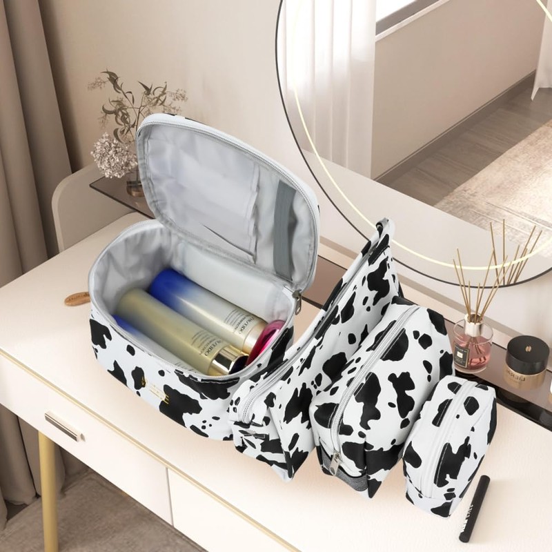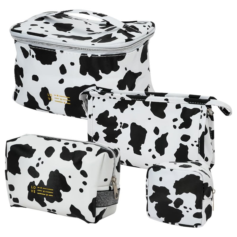 - 4 Pcs Cosmetic Bag Set: You will get a whole set of cow pattern toiletry bag set, including four different sizes of toiletry bags, perfect for your daily and travel items storage, can meet your different storage needs
