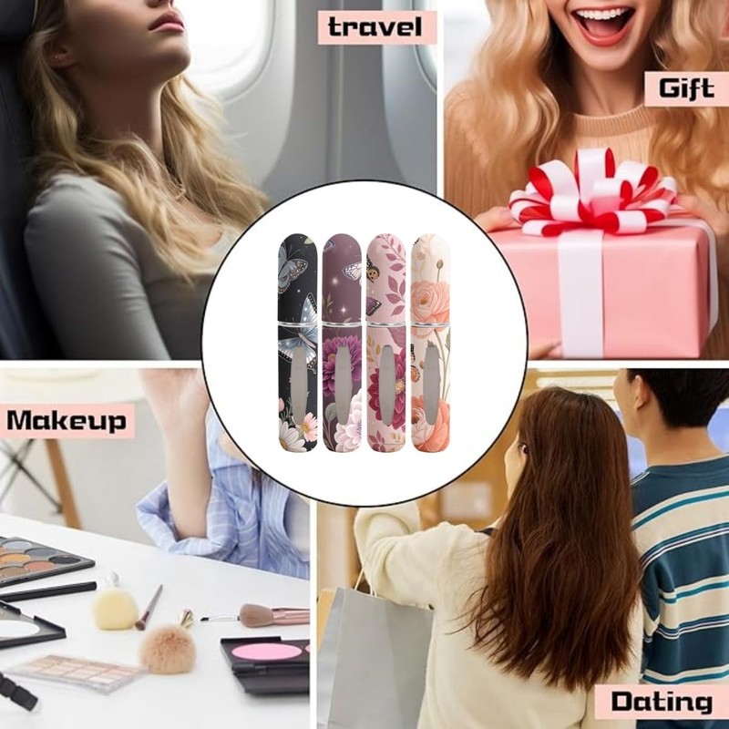 Transform your favorite perfume into a travel companion with these elegantly designed 5ml refillable perfume atomizers. Each set includes 4 beautiful bottles adorned with delicate butterfly and floral patterns in various color schemes. The bottles feature a convenient visible window to monitor perfume levels and a secure pump mechanism. At 3.3 inches tall and 0.60 inches in diameter, these slim atomizers slip easily into purses or makeup bags. Perfect for travel, dating, makeup touch-ups, or as a thoughtful gift. Installation is simple - just remove your perfume's spray cap, align the atomizer, and press firmly to transfer. Compatible with most standard perfume bottles having nozzle tubes over 8mm long and under 4mm in diameter. The sophisticated designs and practical functionality make these atomizers ideal for keeping your signature scent close at hand wherever life takes you.