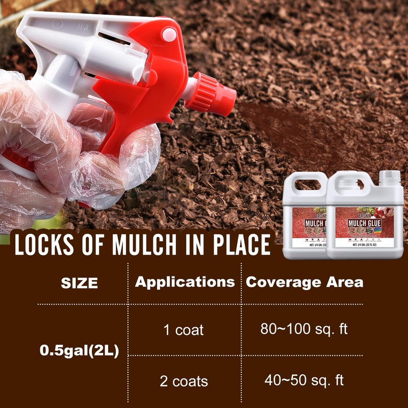 - LONG-LASTING MULCH DYE & GLUE - Our upgraded version brown mulch glue offers a 10x stronger bonding effect while giving the mulches a fresh new look. Effectively securing mulch in place and preventing displacement or erosion caused by wind, washouts from heavy rain, or foot traffic. By forming a strong bond with the mulch, guaranteeing a landscape that lasts long and requires minimal upkeep.