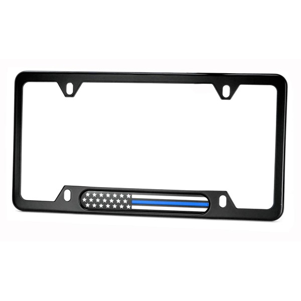 Black Stainless Steel License Plate Frame (Black/Chrome Flag with Thin Blue Line)