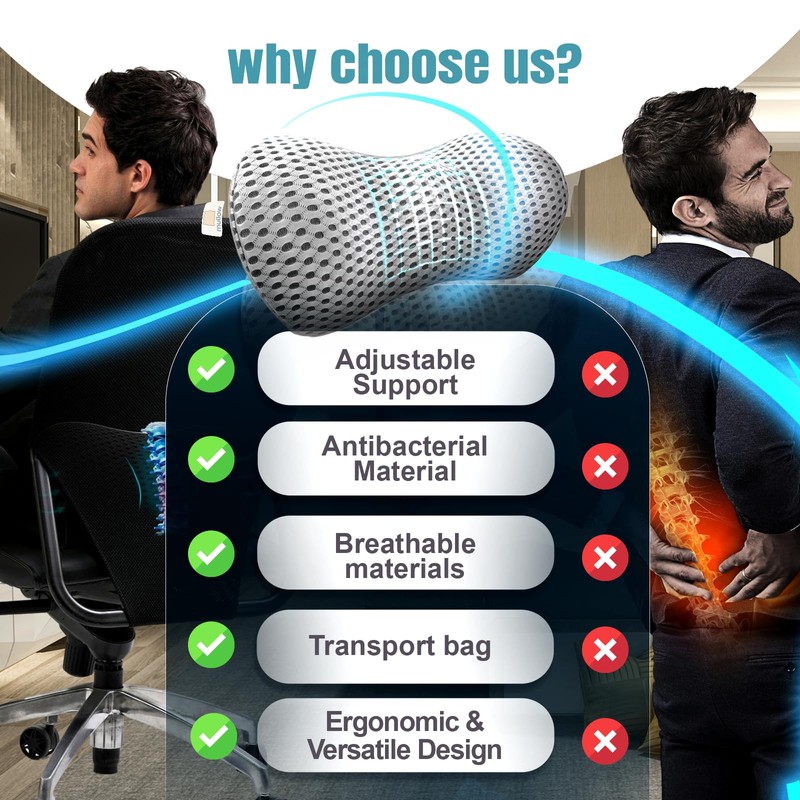 - 🧠 Premium Memory Foam Comfort – Designed with high-density memory foam, this pillow molds to your back, offering lasting support for low back pain relief throughout the day.