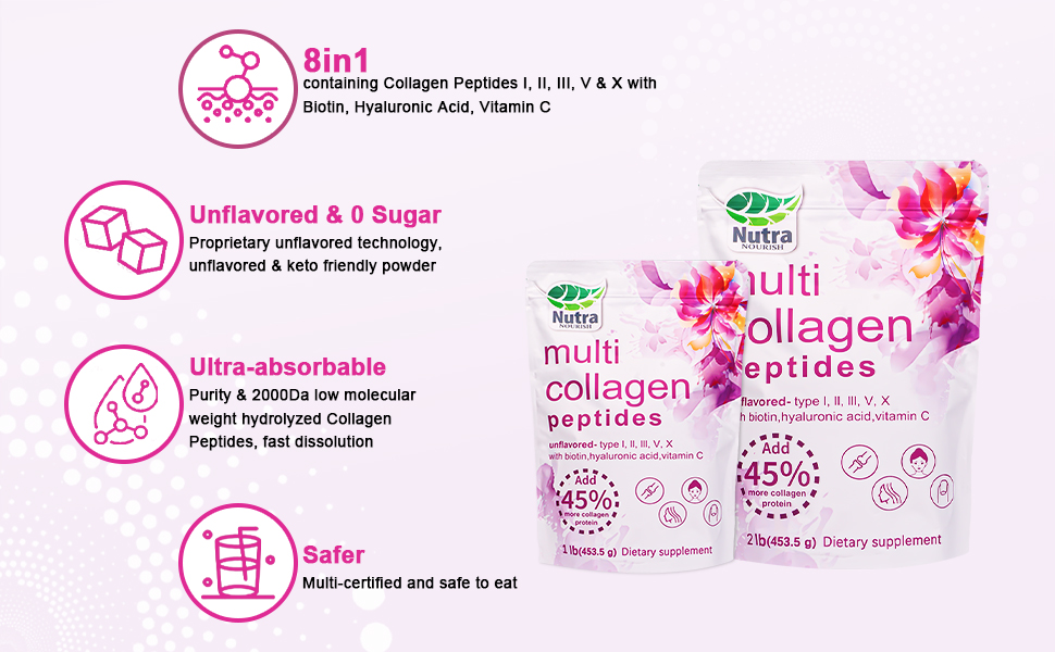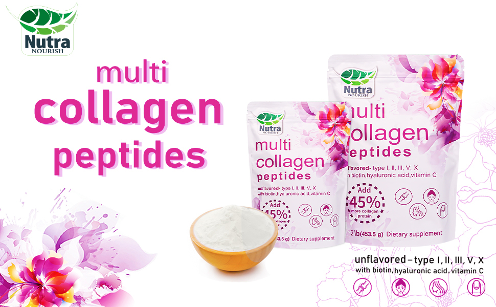 - NutraNourish 7 in 1 full spectrum hydrolyzed collagen peptides powder. The ultimate anti-aging complex that offers up to 11g of pure pasture raised collagen peptides per serving. Created with premium hydrolyzed collagen for complete and efficient absorption that nourishes the hair, skin, nails, and joints.
