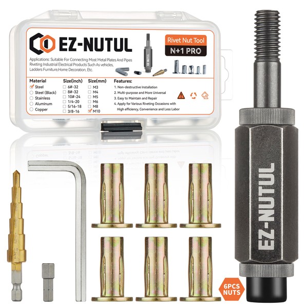 - Newly Upgraded Rivnut Installation Set: Parts include plus nuts, step drill, hexagon bit, hex wrench, and riveter assembly.